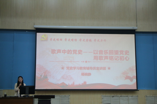 以音乐回望党史,用歌声铭记初心。杨晓静老师通过新民主主义革命时期、社会主义革命和建设时期、改革开放和社会主义现代化建设时期和中国特色社会主义新时代四个阶段来娓娓讲述歌曲中的党史故事。