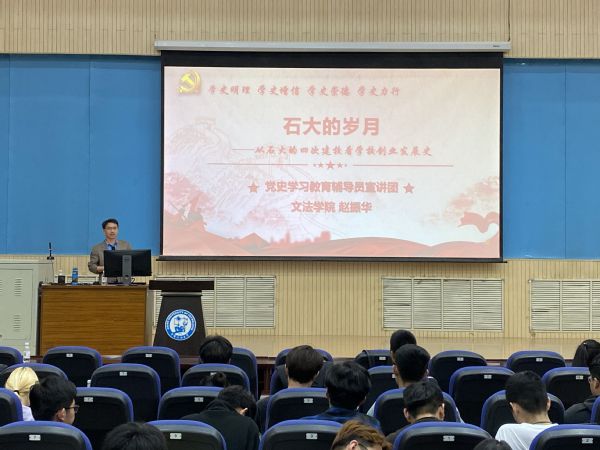 赵振华沿着时间脉络,讲述了我校的四次建校概况,带领学生们回顾了北京石油学院、华东石油学院、石油大学、中国石油大学四个历史时期的发展历程。他还介绍了学校各个方面建设的精神风貌和杰出成就,对学校人文、地理、教学、科研及对外交流等方面进行了阐释,展示了我校各个时期的办学成果以及各种名人事迹。“一幅幅老照片阐述着石大的往昔,从中感受到了石大的各项成就与先辈们的共同努力分不开。”预备党员音乐1902班陈旺感慨道。