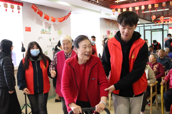 活动伊始,支部成员立足老人实际需求,向老人分发牛奶等慰问礼品,主动献爱心、送温暖、助他人,助力提高老人的生活条件。随后,支部成员组建文艺表演团队,为老人们带来快板、新疆舞、歌曲等形式多样、内容多彩的文艺节目,活跃现场气氛,丰富老人生活,提振老人情绪。为拉近与老人的距离、吸引老人积极参与,支部成员歌唱《我和我的祖国》《我的祖国》《北京的金山上》等经典红歌,老人们打起节拍、一同跟唱,在悠扬旋律中呼唤民族情感,在活跃氛围中加深彼此情谊。活动最后,支部成员搀扶老人回到各自房间并与其亲切交流、悉心交谈,将爱心付诸行动,以热情点燃欢乐,用陪伴传递温暖。“网红‘火龙果’奶奶”崔奶奶等老人与支部成员友好交流,向支部成员介绍自己的家庭、经历与在护养院的生活日常,询问支部成员的学习情况并鼓励支部成员努力学习、珍惜大学平台、实现自己的理想。