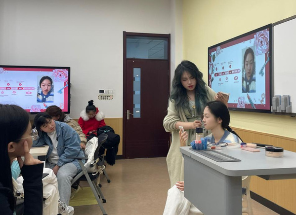 主讲人高羽彤现场上妆 杨富媛摄