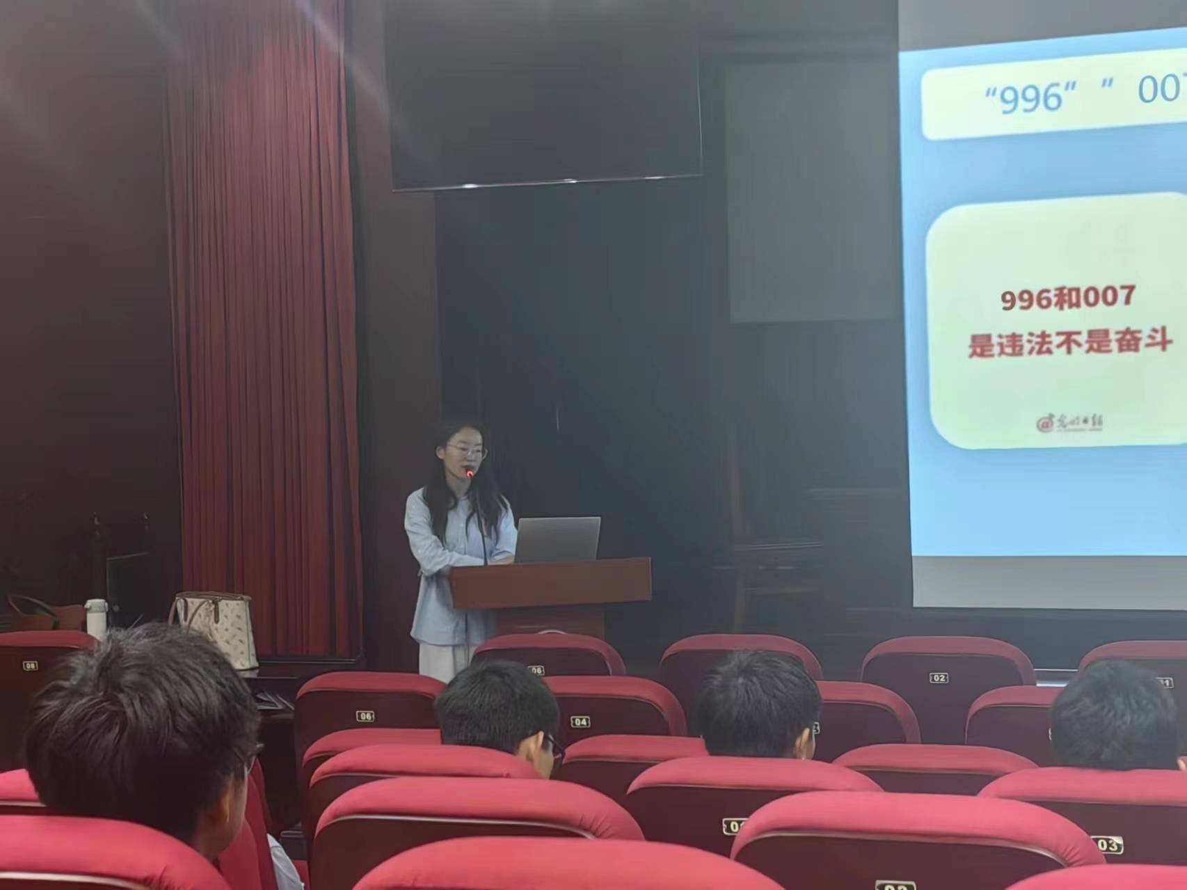 第二部分,宣讲团成员向同学们介绍了劳动者的权利,鉴于时间关系,重点讲述了平等就业的权利、取得劳动报酬的权利、休息休假的权利。在帮助同学们了解自身合法权益的同时,宣讲团成员也重点提示同学们,在就业过程中并非遇见任何事情都要通过法律途径进行对抗,要结合自身的实际情况、结合对这份工作的具体考量进行综合分析,切勿莽撞行事。