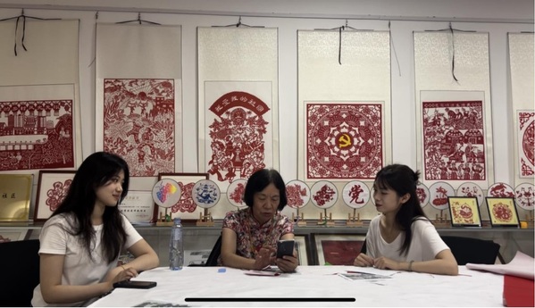 随后,实践队成员对王老师进行了深入的访谈。王老师以其丰富的经验和深厚的情感,讲述了自己作为剪纸非遗传承人的心路历程。从跟随母亲学习剪纸,到成为区级、市级乃至省级的非遗传承人,王老师始终坚守着对剪纸艺术的热爱与传承。她还分享了如何将传统手工艺术与现代建筑巧妙结合,创造出具有西海岸特色的城市名片,以及如何在多媒体时代通过社交平台推广剪纸文化的经验。