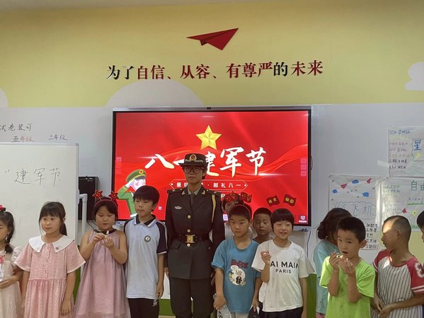 2024年8月1日,经支教队筹备,在各班班主任的组织下开展国防教育主题班会。负责人联线中国石油大学(华东)国旗护卫队队长,为孩子们做“国家、国旗、国歌”主题讲座,并展示护卫队日常训练和礼仪。通过了解国旗护卫队这一学校爱国主义教育的重要载体,增强了同学们的民族自尊心和自豪感,让学生更加了解国家的历史和文化,激发了他们的爱国热情和社会责任感。支教队队长沈舒作为护卫队中的一员,身着常服,为孩子们讲解建军节的历史与中国的军种。