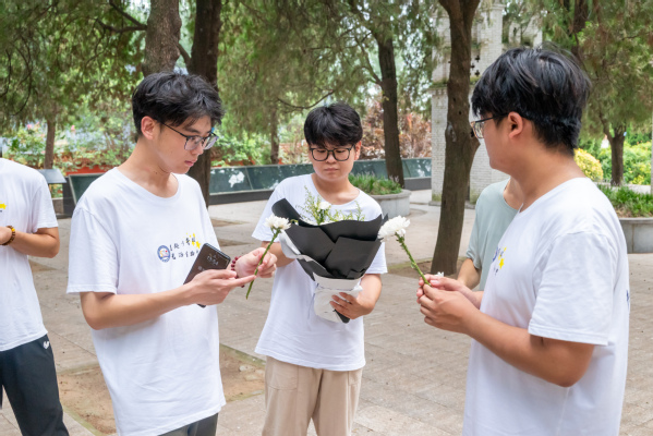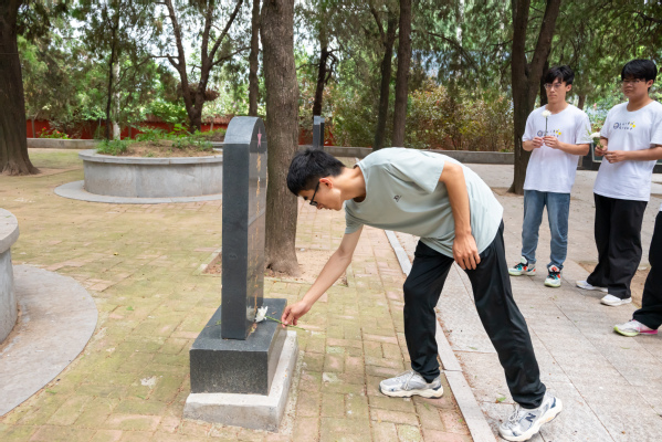 在英烈陵园和无名烈士纪念广场,一行人瞻仰烈士墓碑,主动向前献上白色菊花以表对英雄的无限敬意。在高大雄伟的纪念石碑亭中,实践队员们仔细阅读石碑体上形态各异的文字,发现这些文字是来自于各个地区、各个