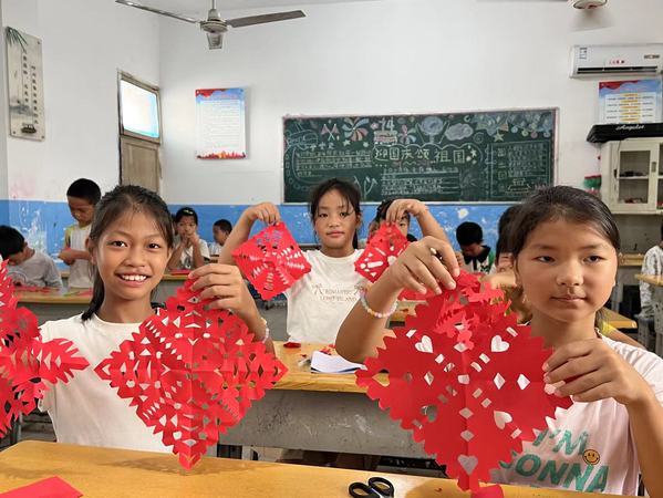 本次授课对象以布依族学生为主。“贵州省是红军长征路上的重要节点,蕴含着丰富的红色文化资源和红色精神力量。”课堂伊始,实践队队长王逸凡围绕贵州省的红色文化资源给学生们讲解了长征路途之艰辛、长征精神之可贵。随后,以铸牢中华民族共同体意识为主线,实践队又概述了布依族、苗族和汉族的民族文化和风俗特色,让学生们见证中华文化的多元和包容,感受到民族团结的力量。最后,实践队给学生们展示了一幅幅优秀的剪纸作品,并鼓励学生亲自动手操作。从设计起稿、固定纸张,再到剪刻图案、修饰整理,实践队成员耐下心来指导学生,孩子们认认真真地画出图案,行云流水地使用剪刀,最终将一张张简单的红纸定型为一幅幅标准且美丽的剪纸作品,展示着自己的创造力和独特的审美观念。
