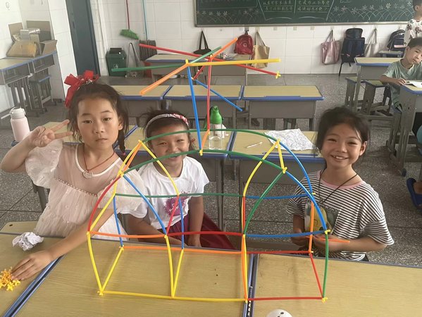 除此之外,老师还开设了手工课程,像用吸管搭建小建筑等,自身音乐、美术专业的老师开设唱歌、美术课程,充分发挥自身专业特长,讲解基本音乐、美术知识,包括简单音乐理论、乐谱阅读、乐器识别、音符识别、色彩理论、构图技巧、绘画技巧等。老师们力争将枯燥的理论知识用浅显易懂的方式讲述出来,同时还进行了课上的展示,老师们或放开歌喉,高歌一曲;或以粉笔为画笔,画出同学们呼声最高的公主。