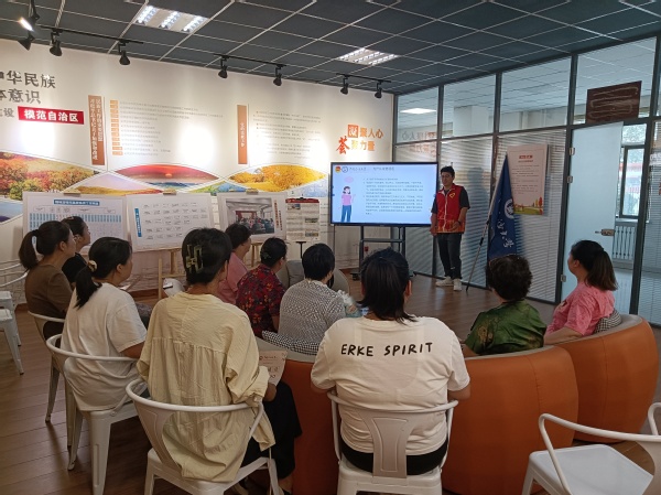 随后,为巩固宣讲效果,语韵边疆实践队队员采取“单字朗诵+句段朗读”的方式来让社区居民们亲身体会普通话,实践队队员举出“滞”、“喟”、“隘”等单字个例,让老人们体会到较为生僻的字的发音技巧,并随机列举了《白杨礼赞》和《读书人是幸福的人》两篇经典文章中的精彩句段,邀请老人们朗诵,实践队员根据朗诵情况现场一对一进行耐心的纠正与演示,得到了社区居民们的一致认可。在宣讲结束后,为增强民族间情感联系,语韵边疆实践队队员组织社区居民们开展了发放文创帆布包的活动,每个人脸上露出了灿烂的笑容。