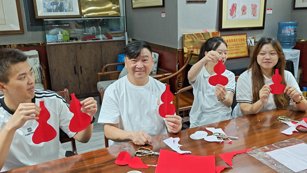 在访谈中,何小锵老师提到现代科技的发展对传统的人工剪纸有一定的冲击,手工需要几小时完成的作品,机器几分钟甚至几秒种就可以复刻。然而机器是没有生命没有思想的,它只能机械地完成指定作品,但人是鲜活灵动的,不会剪出完全一模一样的两副作品,每一幅都是独一无二的、是手艺人创作思想的外化成果。何老师耐心地展示了从选材、设计到剪刻、装裱的每一个步骤,并一步一步地带领实践队剪了一幅一刀完成的“红葫芦”图。队员们惊叹于剪纸技艺的精湛,更被老师一刀一剪中凝聚的匠心与智慧感染。