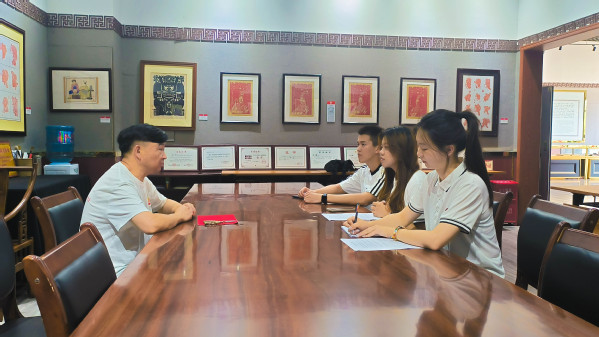 实践队在仪陇剪纸博物馆发放调查问卷,并同非物质文化遗产仪陇剪纸的传承人何小锵老师进行了深度访谈,了解更多剪纸背后的故事与传承的匠心。何小锵老师作为仪陇剪纸的第四代传人,已从事剪纸艺术40余年,他不仅继承了祖辈们的精湛技艺,更在传承中勇于创新,将现代元素巧妙融入传统剪纸之中,创作了新式剪纸艺术,如火烧剪纸、撕纸、书法绘画剪纸三合一的剪纸艺术表现形式,让仪陇剪纸焕发出新的生机与活力。