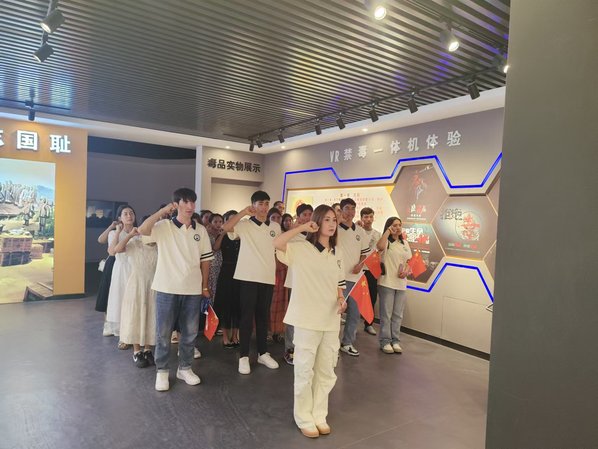 在参观过程中,队员们还积极参与了互动体验环节。他们通过模拟毒品检测、观看禁毒教育影片等方式,亲身体验了毒品的危害和防范的重要性。“远离毒品,珍爱生命!”活动尾声,实践队全体成员进行禁毒宣誓,铿锵有力的誓言表达了队员们抵制毒品的坚定决心。