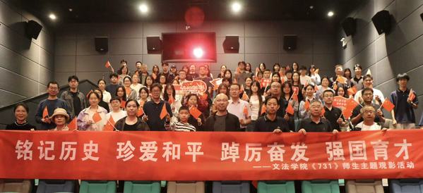 影片《731》以真实历史事件为原型,以平民视角切入,通过详实的史料考证与极具震撼力的影像语言,深刻揭露了日本731部队在侵华战争期间犯下的严重反人类罪行,更生动展现了绝境中中国人民宁死不屈、奋力抗争的民族气节。现场寂静肃穆,不少师生热泪盈眶,更加坚定了守护和平、奋发图强的共同信念。观影结束后,在场人员的心情久久不能平复。党委书记谭树成表示,通过观影回顾历史、直面创伤,是为了以史为鉴,更加坚定地捍卫和平、开创未来。他寄语文法师生从历史中汲取精神力量,踔厉奋发、砥砺前行,将爱国情、强国志、报国行自觉融入日常学习、工作和生活中。随后,师生纷纷在横幅上郑重写下爱国誓言。