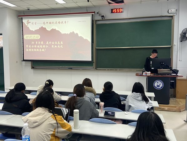 团支部邀请“青马燎原宣讲团”于南教楼119教室进行宣讲,宣讲团成员以“英雄不朽,薪火相传——抗美援朝老兵与青年一代的对话”为主题,系统梳理了抗美援朝战争的历史背景、关键战役与伟大胜利。这不仅激发了汉语2402团支部成员的民族自豪感与时代使命感,也为团支部凝聚青春力量、培育爱国品格奠定了坚实基础。