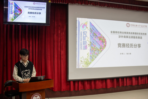 在活动现场,鲁力萌聚焦“国际贸易竞赛涉外商事法律服务赛道”,从赛事选题、法律尽调流程、报告框架设计等维度展开分享,对比赛赛程以及作品要求进行说明,并结合本团队的参赛作品《兖矿能源ESG尽职调查报告》,对法律尽职调查报告进行解析,讲解了法律尽调中“资料收集—审查核对—报告撰写”的实操步骤,为在场学生提供了可借鉴的赛事备赛路径。